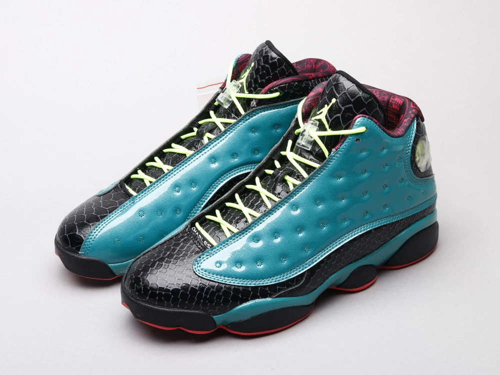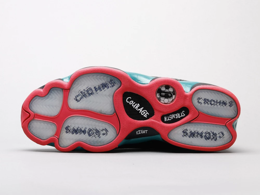 patient at the Doernbecher children’s hopsital battling Crohn’s Disease, John give the Air Jordan 13 a look quite unlike it’s ever seen before, featuring a glossy patent leather in snakeskin-embossed black and teal paneling. The shoe also sports a number of person touches by John, including his soccer number, a cartoon kid with a raised brow, “Crohn’s” on each outsole to signify how he wants to stomp out the disease, and seven pills to signify the medicine he takes ever day to manage his illness.