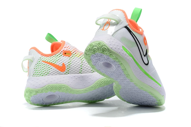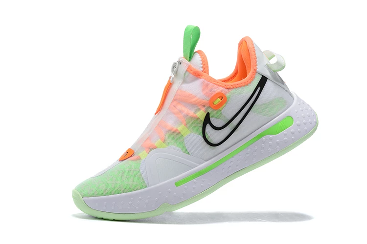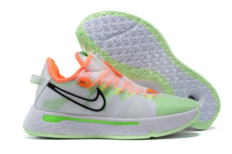 This latest offering of the Nike PG 4 sports a White translucent shroud on the upper paired with a mix of Bright Orange, Neon Green, and Yellow accents. Black outlined Swooshes on the lateral with “GX” branding printed on the tongues and insoles completes the design.