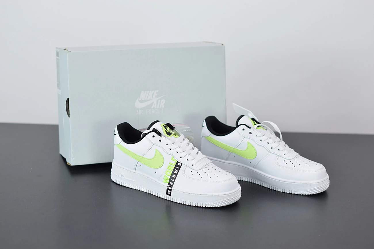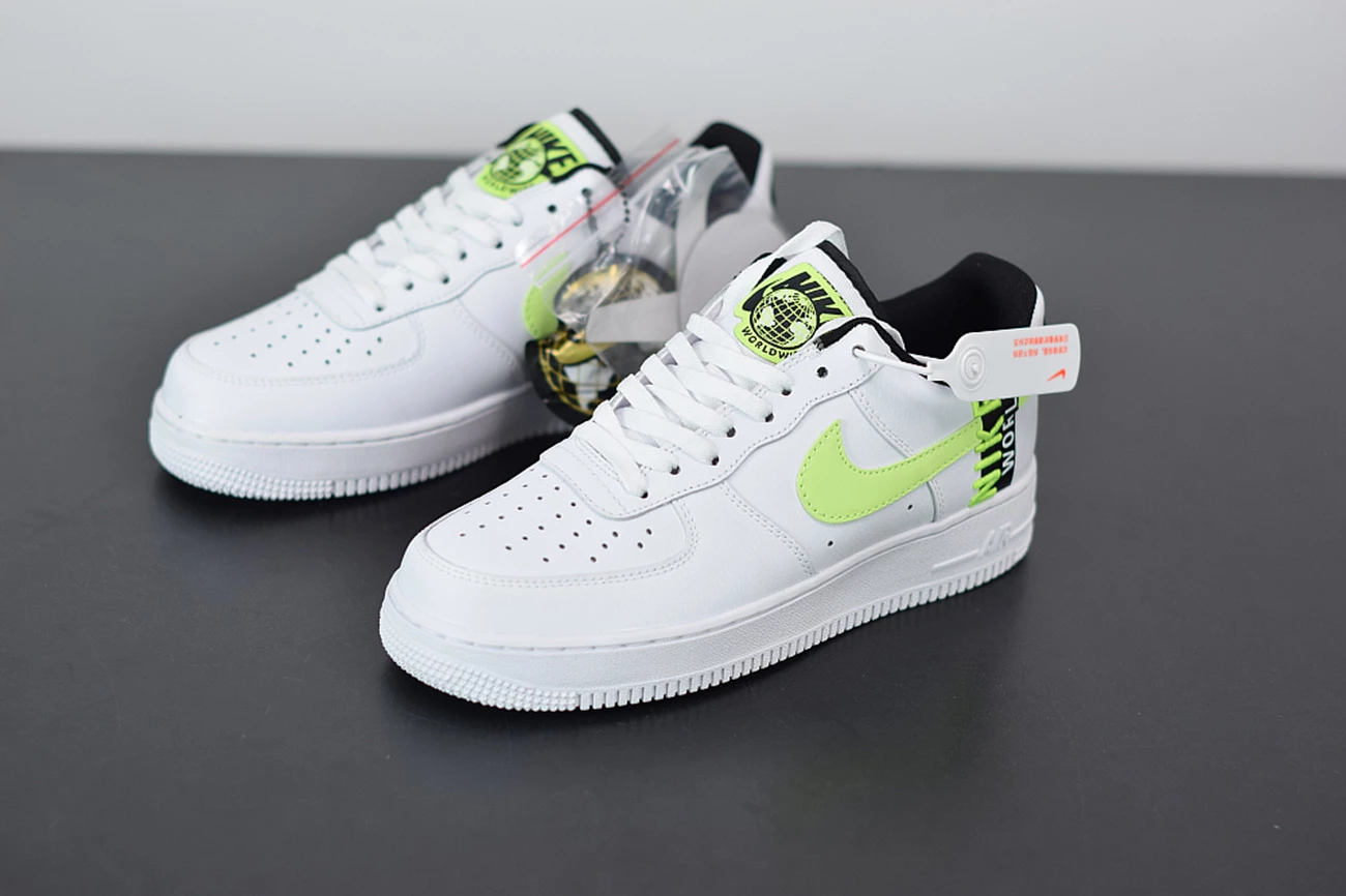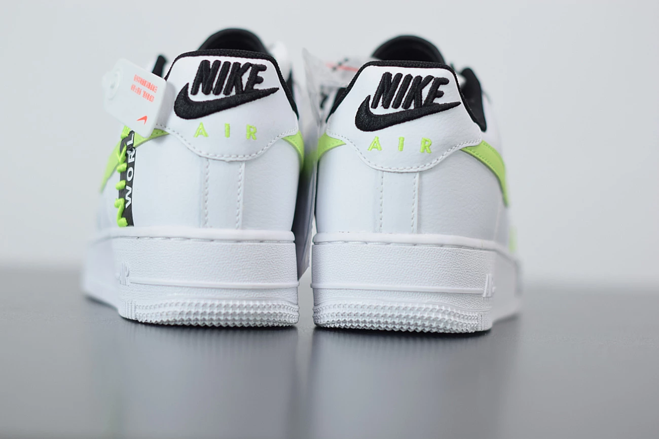 ‘Nike World’ appears embroidered on to the heel of the sneaker in white and volt, whilst the insoles have also been updated with ‘Worldwide’ printed in white against the black fabric. High levels of comfort are assured with the legendary, Air-cushioned sole and the rubber outsole for traction and durability. The low cut collar and perforation holes across the toe box take the comfort up a notch, so you can wear this white green AF1 all day long.