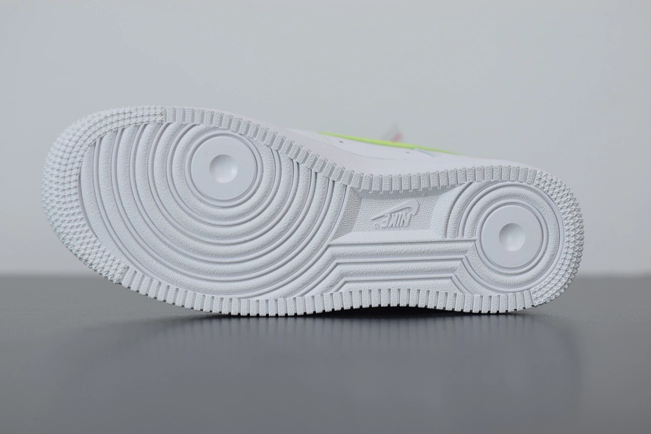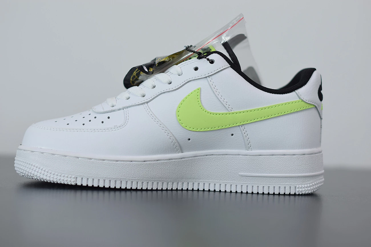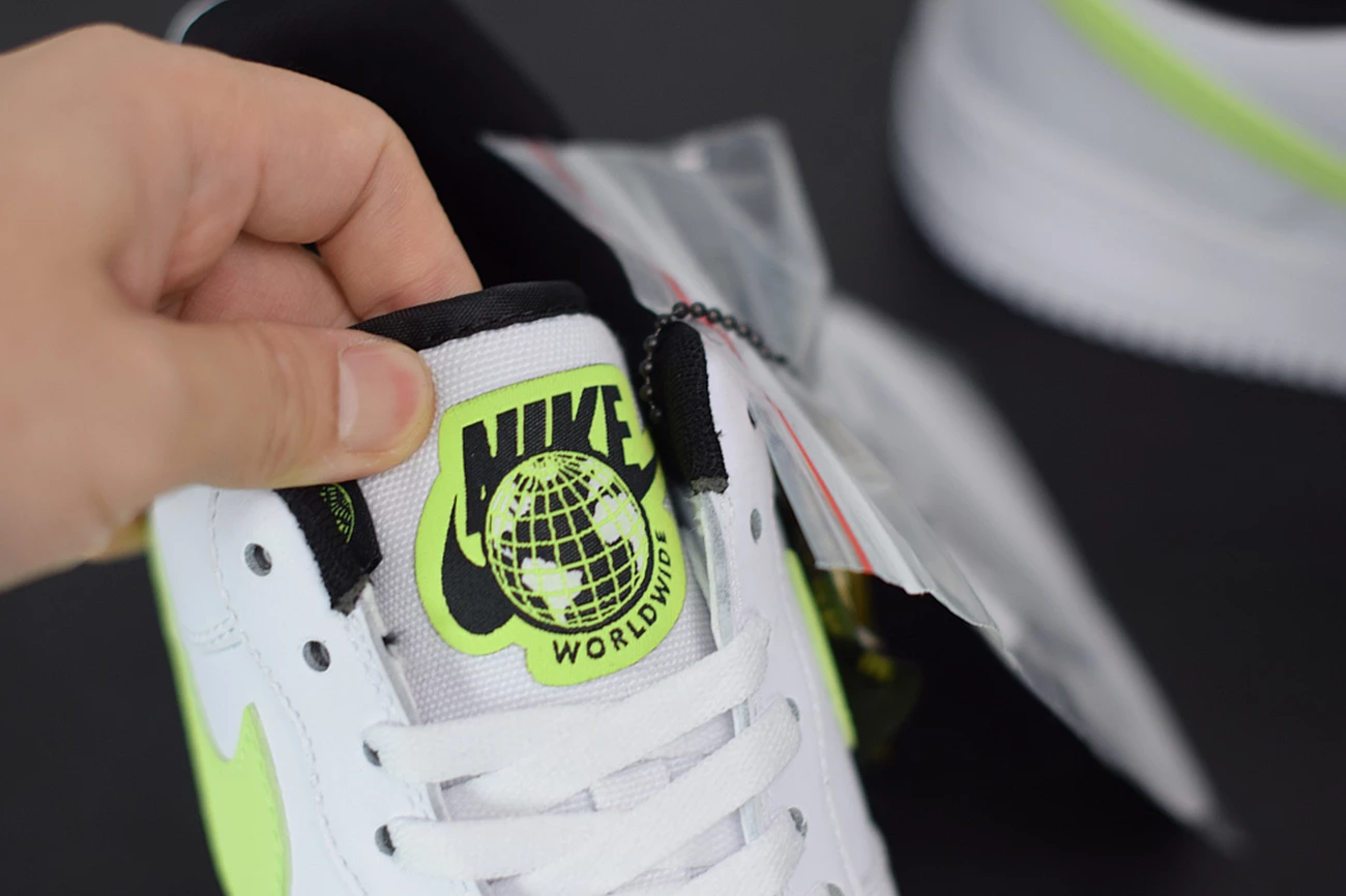 ‘Nike World’ appears embroidered on to the heel of the sneaker in white and volt, whilst the insoles have also been updated with ‘Worldwide’ printed in white against the black fabric. High levels of comfort are assured with the legendary, Air-cushioned sole and the rubber outsole for traction and durability. The low cut collar and perforation holes across the toe box take the comfort up a notch, so you can wear this white green AF1 all day long.