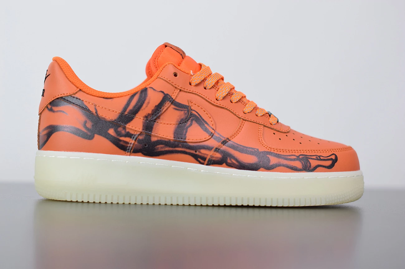 A bright pumpkin orange paints the entire leather draped silhouette, with matching tongue tabs and places. Classic features like toe perforations, tongue and heel brandings are inherited onto this iteration from the OG model. Also, the iconic Swoosh logo appears on the sidewalls, blending into the base layer. This allows the Skeleton design on top to steal the show! An illustration of spooky Skeleton X-ray graces the entire upper, making this pair a show-stopper