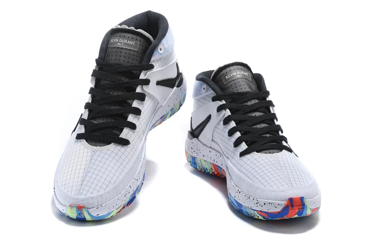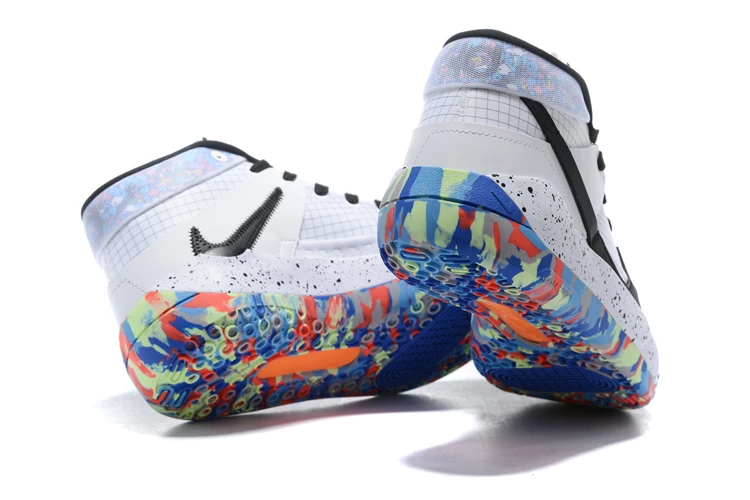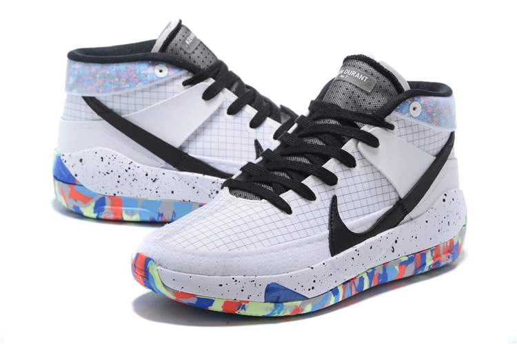 This Nike KD 13 comes dressed in a Multi-Color, Racer Blue and Smoke Grey color combination. Highlighted with White on the base while a Black grid runs across the base. The same shade then lands on the tongue, laces, Swoosh logo and speckled midsole. Completing the look is Multicolor camouflage graphic on the heel and rubber outsole.