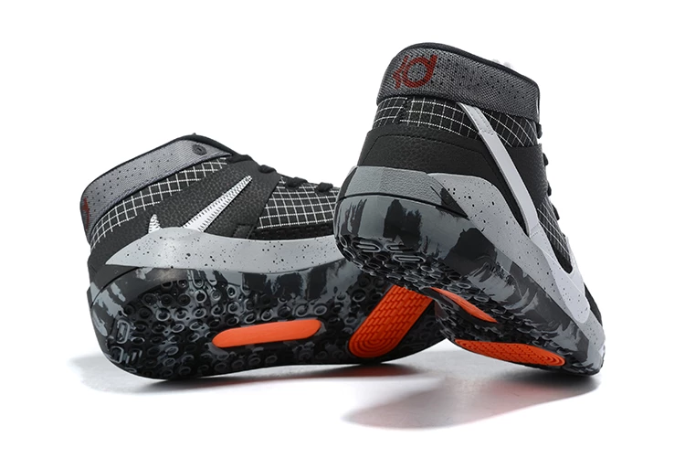 this Nike KD 13 features Black across the base while highlighted with a grid pattern. Following we have White on the leather Swoosh logos across the sides, Orange lands on the heel branding, insoles and outsole. Combining Black and Grey on the midsole which has an Ore theme while a camouflage like outsole finishes the look.