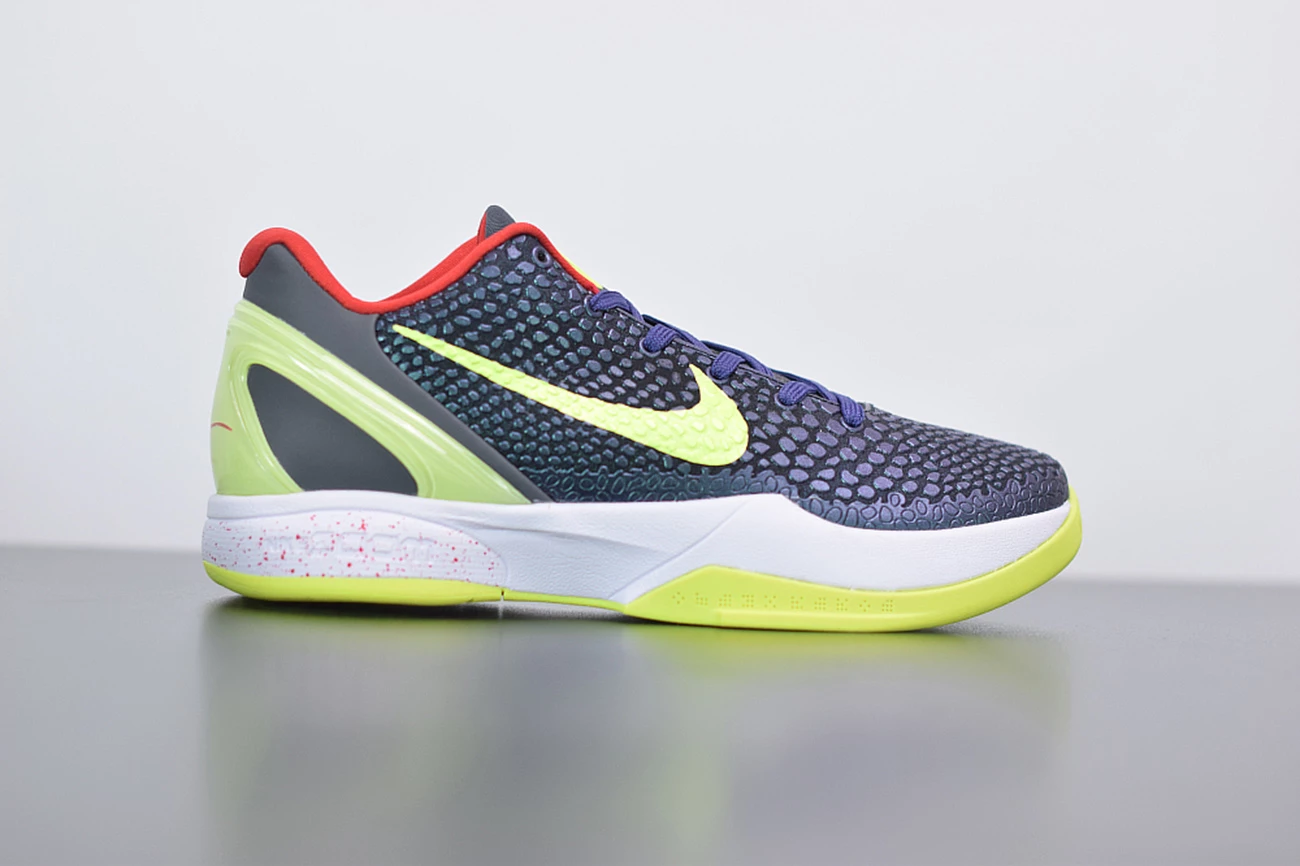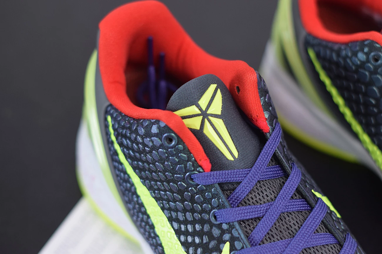 Inspired by DC Comics villain The Joker, the “Chaos” edition of the Nike Kobe 6 Protro features a snakeskin-textured upper with a chameleon finish and Purple laces. Volt Green accents on the Swoosh, Kobe tongue logo and outsole, with Red appearing on the liner and speckling at the White midsole completes the design.
