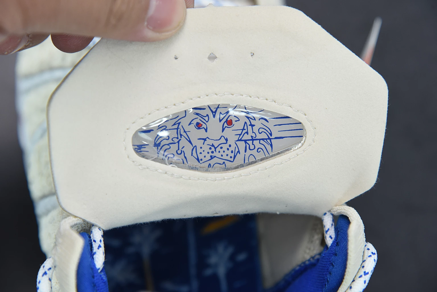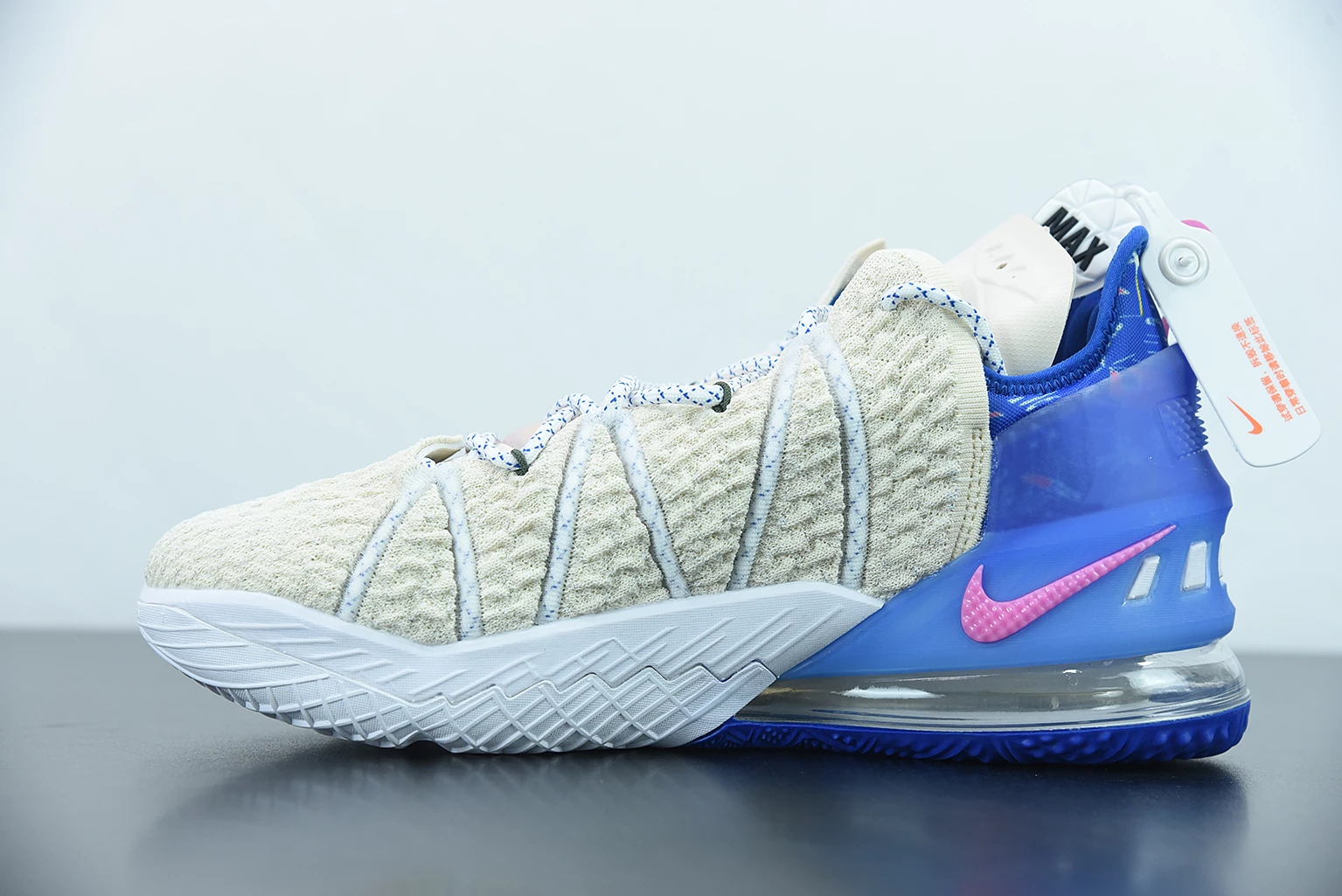 This Nike LeBron 18 features a Neutral Sand finish on the Knitposite 2.0 upper reinforced with a cable-inspired rib cage that extends down to the footbed. A breezy palm tree graph on the heel, visible beneath the semi-translucent TPU heel clip atop a White and Blue rubber sole completes the design.