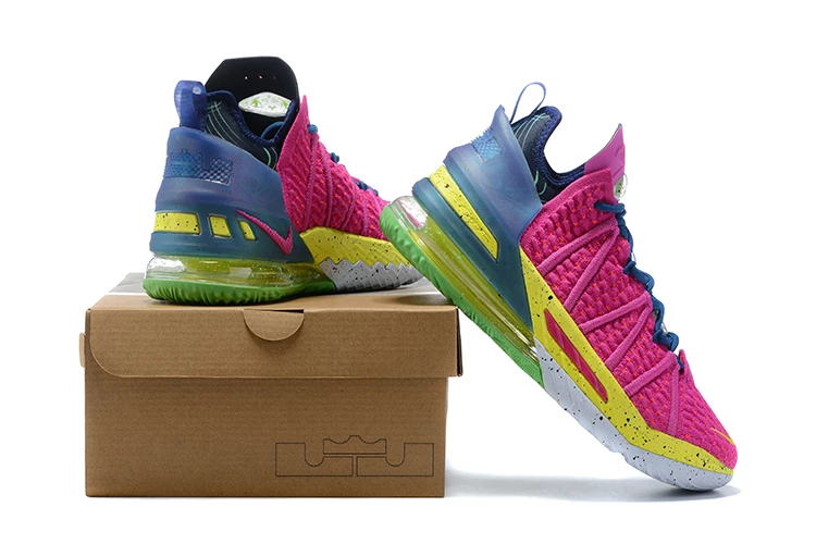 Dressed in a Pink Prime and Multicolor color scheme. This Nike LeBron 18 features a Pink Knitposite 2.0 upper highlighted with bright Neon contrasting accents throughout. A Grey speckled section on the sole offsets the bright tones completing the design.