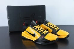 This offerDA6809-700Yellow upper detailed with laser-etched verbiage spelling out “Five Rings.” Yellow Kobe tongues and Swooshes on the sides atop a gradient midsole and translucent outsole completes the design.